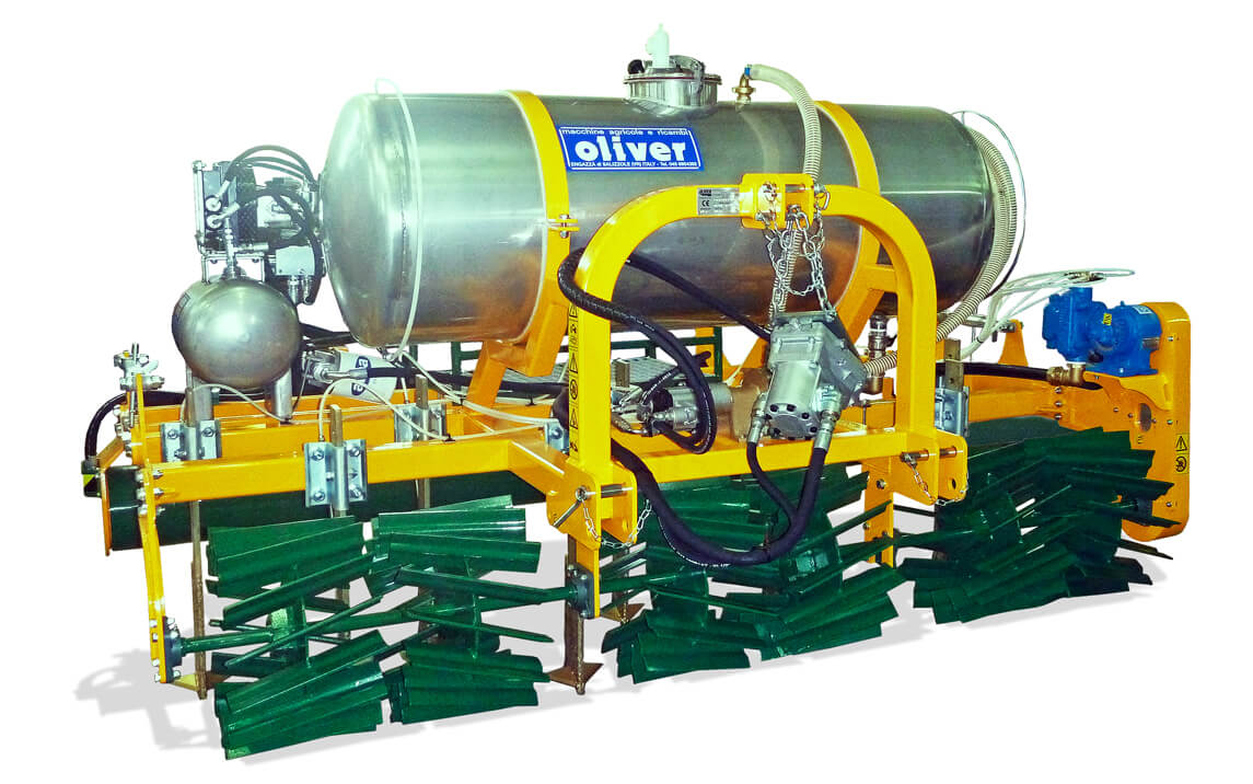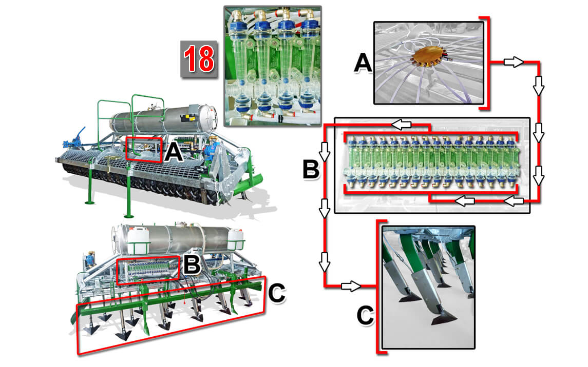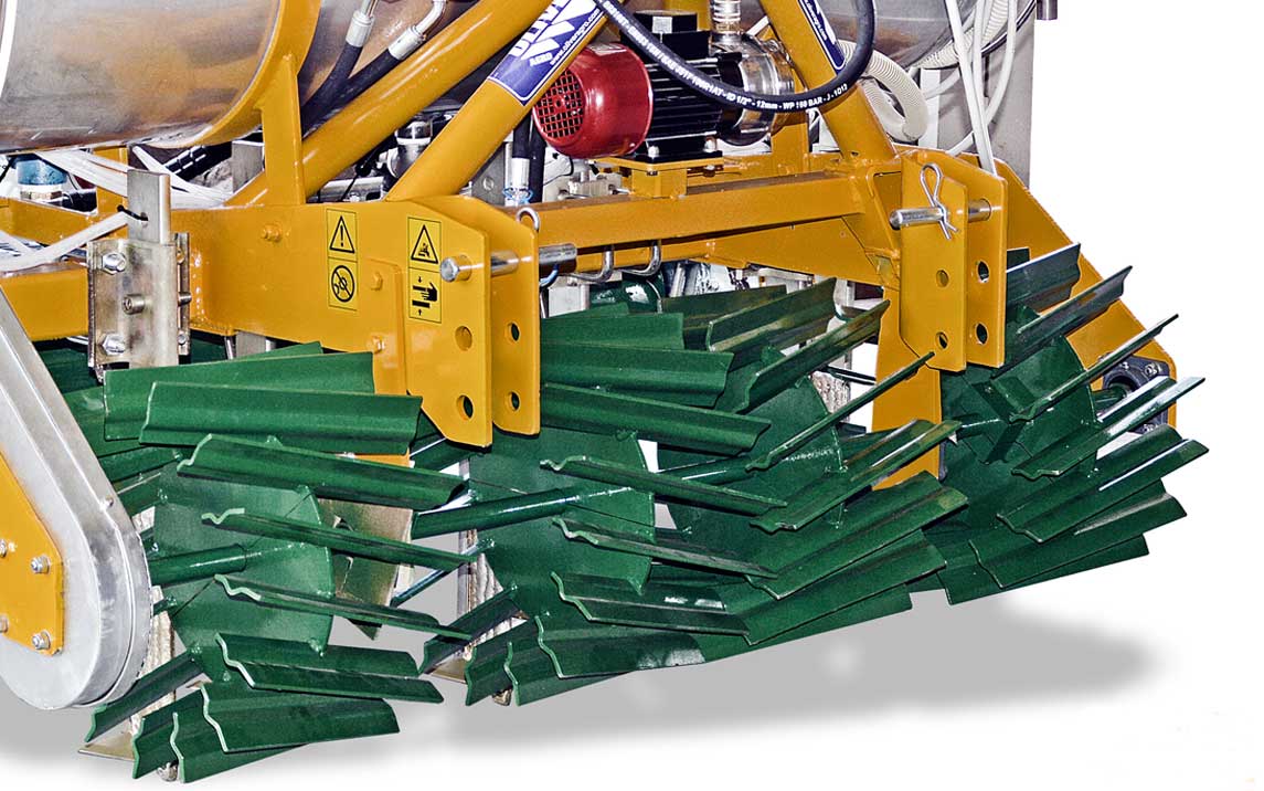 Неотъемлимые (сотавные) колеса (2), которые готовят почву перед прохождением якорей фумиганта. Благодаря их особой форме, можно измельчать грунт, устраняя все его недостатки и делая его ровным и однородным.